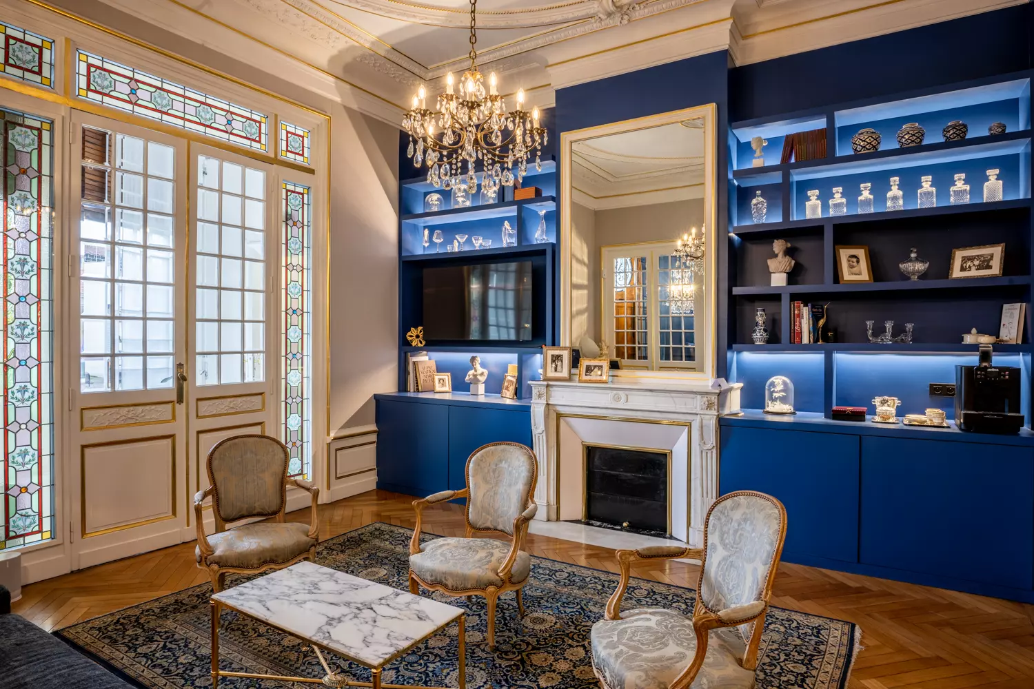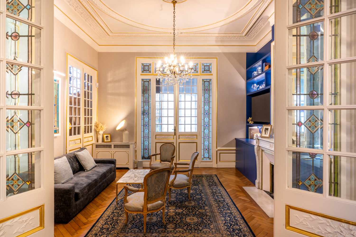 - Le salon bleu – 34 personnes en plénière – écran – enfilade 70 m2,
